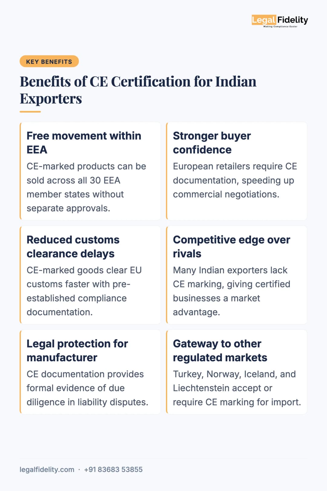 CE certification opens the EEA market, giving certified products access to over 500 million consumers across 30 countries. Beyond market access, the benefits are significant for Indian businesses competing globally.